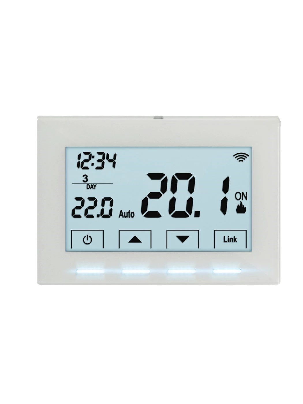Termostato touch screen con lcd retroilluminato. Montaggio sia ad incasso che esterno. Adatto per il funzionamento estivo/invernale gestisce l'accensione/spegnimento della zona (testine o pompa di circolazione), attraverso i sensori a bordo. Sistema con due livelli di temperatura e funzione antigelo. Possibilità di variare il set point temperature e di correzione in base alla posizionamento del prodotto.